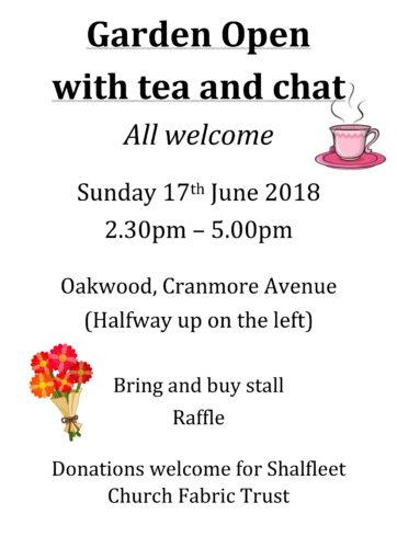 With grateful thanks to Diana Chesterton, there will be an Open Garden at Oakwood, Cranmore Avenue, on Sunday 17th June, from 2.30. All are most welcome, with funds raised going to the Shalfleet Church Fabric Trust.