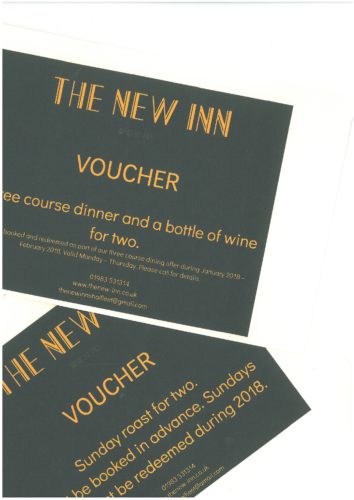 1st Prize – 3 course Dinner for 2 with wine at the New Inn: won by Karen Evatt of Main Road, Shalfleet